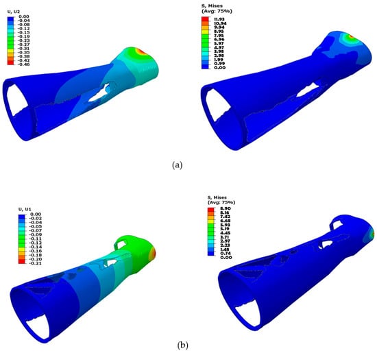 The second analysis compared various designs for PLA material that include different perforation shapes. The PLA material was chosen because the prior analysis determined that it was the most appropriate material. The PLA material had also been endorsed by numerous studies in the past for use in medical and other industrial products because of its superior characteristics and environmental friendliness [,,,]. Figure 12a–f displays the deformation and Von Mises stress for the PLA-based hand splint for Design 2 with circular perforations under three loading directions.