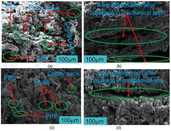 Comparing the SEM micrographs, Figure 13a–d illustrated the differences between the PHPC SLS parts produced from PHP ≤ 0.125 mm and those from PHP ≤ 0.149 mm, before and after breakage in the mechanical tests. Before breakage, the PHP ≤ 0.125 mm SLS specimen showed a higher density and a more extensive sintering neck than the PHP ≤ 0.149 mm specimen (Figure 13c and a, respectively). After breakage, the PHP ≤ 0.125 mm specimen exhibited warp deformation, specifically at the point of breakage (Figure 13d), while the PHP ≤ 0.149 mm specimen displayed warp deformation covering a larger area (Figure 13b). PHP specimens of ≤0.125 mm exhibited good density, a high impact strength, and fewer holes, making it a suitable choice for PHPC applications.