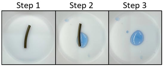 Acid/base indication testing procedure example with PLA-PEG-TB. Step 1: filament sample is placed in a plastic weigh boat; step 2: 500 µL of pH 13 solution is added to the filament sample; step 3: after 15 min, the filament is removed and the color of the solution is recorded.