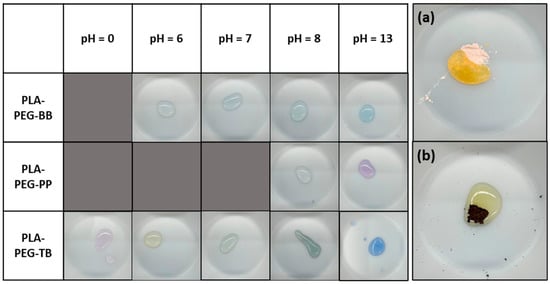 To test the pH-indicating efficacy of the filaments, solutions were made with pH values of 0, 6, 7, 8, and 13, allowing the evaluation of the effectiveness of the indicting filaments when exposed to strong acids, strong bases, and neutral solutions. These pH values also reflect the most beneficial pH ranges for each of the indicators used (pH 6–8 for bromothymol blue; pH > 8 for phenolphthalein; and pH 0–14 for thymol blue). A total amount of 500 µL of drops of each solution were placed on the surface of samples of each indicating filament, and the resulting color change was recorded after a maximum of 15 min (Figure 3). Additionally, the pH indicator powders were tested with the same solutions to determine their efficacies before and after heat treatment at the highest extrusion temperature used for the filaments (180 °C).