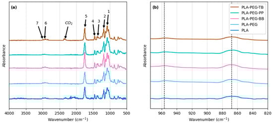FTIR spectra of filaments created in this study at: (a) 500–4000 wavenumbers and (b) 820–970 wavenumbers. Labeled arrows correspond to peaks identified in Table 6. Dashed lines denote peaks at 956.5 cm−1 and 868 cm−1.