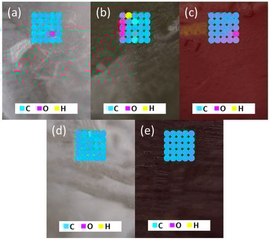 Microscope images and elemental maps of: (a) PLA, (b) PLA-PEG, (c) PLA-PEG-BB, (d) PLA-PEG-PP, and (e) PLA-PEG-TB filaments. Maps on each sample show 25 LIBS analyses in 5 × 5 grids.