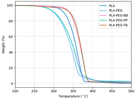 Consistent with previous studies [,], TGA confirmed that the addition of PEG lowered the thermal stability of PLA (Figure 8 and Table 7). Interestingly, the addition of pH indicators along with PEG had varied effects on PLA’s thermal stability. PLA-PEG-BB and PLA-PEG-TB filaments both had higher degradation temperatures (Td95%) than the PLA-only filament, while the PLA-PEG-PP filament had a lower degradation temperature, similar to that of PLA-PEG (Figure 8 and Table 7).