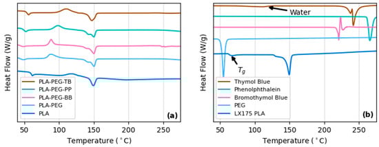 Additional thermal transitions, i.e., Tg and Tm, and crystallinity were determined via DSC. While the melting temperatures of all filaments were similar (~150 °C), the Tg and the crystallinity changed with the addition of PEG and indicator powders (Figure 9a and Table 6). The addition of PEG lowered the Tg of the PLA filament by ~10 °C, consistent with results seen in other studies [,,,,]. PLA-PEG-BB and PLA-PEG-PP similarly lowered Tg, suggesting that the glass transition temperature in these filaments was primarily driven by the addition of PEG rather than the indicator powders. The PLA-PEG-TB filament had a Tg in the middle of those of the PLA-only filament and the other filaments (Table 7), suggesting that thymol blue may increase the Tg of PLA-PEG composites. Of the raw materials used, only the LX-175 PLA pellets had a measurable glass transition temperature of 65 °C (Figure 9b). The step at 117 °C in the thymol blue DSC plot is attributed to water loss (Figure 9b).