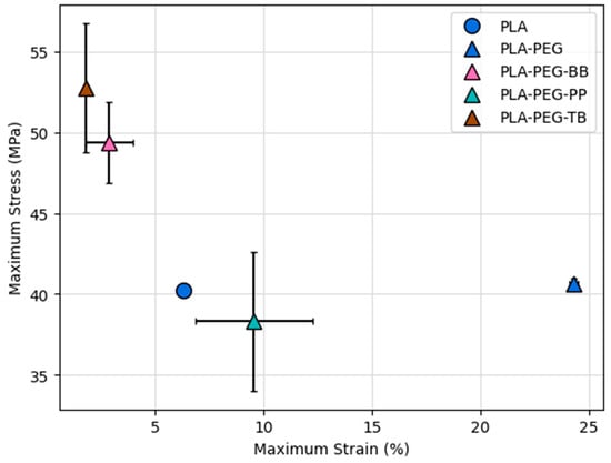 The addition of PEG usually leads to a more ductile PLA filament with lower tensile strength, while the addition of fillers such as clays and nanocomposites typically results in a more brittle material with higher tensile strength [,,,,,,,]. For the filaments in this study, the addition of 10 wt% PEG did not change the tensile strength compared to PLA, but it did increase the filament’s ductility (Figure 10 and Table 8). PLA-PEG-indicator filaments were universally less ductile than PLA-PEG, but the PLA-PEG-BB and PLA-PEG-TB filaments were also more brittle than PLA, while PLA-PEG-PP was less brittle compared to the PLA-only filament. Similarly, the addition of bromothymol blue and thymol blue to PLA-PEG filaments led to an increase in tensile strength compared to PLA and PLA-PEG filaments, while the addition of phenolphthalein had no impact on tensile strength (Figure 10 and Table 9). Tensile strength and ductility are expected to correlate with crystallinity, with higher crystallinity leading to a greater tensile strength and lower ductility. However, this was not the case with many of the filaments created here. As expected, due to the higher degrees of crystallinity compared to the PLA-only filament (Table 8), the tensile strength and brittleness of PLA-PEG-BB and PLA-PEG-TB filaments increased relative to PLA (Figure 10 and Table 9). In contrast, while PLA-PEG and PLA-PEG-PP filaments also have higher crystallinity compared to PLA (Table 8), they are more ductile than the PLA-only filament (Figure 10 and Table 9).