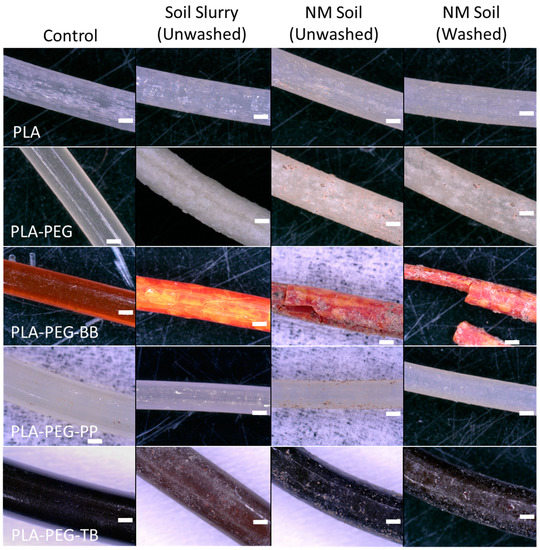 Microscopy of filament samples following aging via burial in natural soil or submersion in a soil slurry revealed noticeable differences in the degrees of degradation based on filament composition and aging methods (Figure 11). The PLA-only filament had some evidence of pitting and microbial growth when aged in the soil slurry. When buried and aged in NM soils, the PLA filament had wear that was more indicative of physical damage from contact with soil grains (likely a result of the weekly gentle mixing of filaments and soils) than microbial degradation, which is expected, as microbial involvement in PLA degradation is usually very minimal compared to abiotic hydrolysis and occurs much later in the biodegradation process [,]. Additionally, very few grains remained on the sample following removal from the soil. These results will serve as a comparison point for the remaining filament samples.