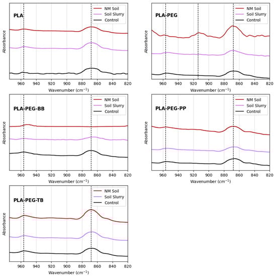 At first glance, few difference were noted between the FTIR traces for aged (soil slurry or soil) filaments compared to those of the control, un-aged samples. However, upon closer inspection of the lower wavenumber region, differences in peaks denoting crystallization were detected (Figure 12). The crystallization peak at 868 cm−1 increased following incubation in NM soil but not in soil slurries for PLA-PEG, PLA-PEG-PP, and PLA-PEG-TB filaments compared to the un-aged controls. Additionally, a peak at 914 cm−1 appeared in the PLA-PEG sample after aging in NM soil, also signifying an increase in PLA crystallinity []. For the PLA-PEG-BB filament, the 868 cm−1 crystallization peak decreased upon aging in the soil slurry and disappeared entirely after incubation in the NM soil. Unlike the modified PLA filaments, the 868 cm−1 crystallization peak for the PLA-only filament remained similar before and after aging.
