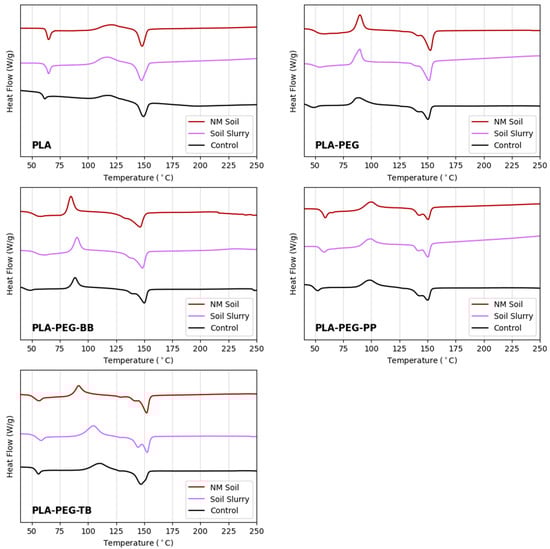 DSC results for slurry- and soil-aged PLA filaments and unaged controls.