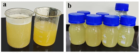 KGM/CA/PVA ternary blend adhesive. (a) Main adhesive of prepared KGM/CA/PVA polymer adhesive; (b) KGM/CA/PVA soil consolidation agent with additives added.