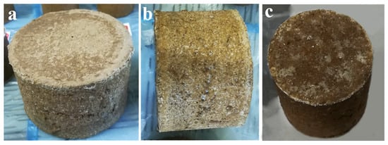 The third type of KGM/CA/PVA polymer-based soil consolidation agent from Table 6 exhibited poor flowability. Even when using larger soil particles to prepare consolidated soil columns, the adhesive film is not only difficult to penetrate into the gaps inside the soil column due to its viscosity but also difficult to form a uniform adhesive film on the surface of the soil column. As a result, the adhesion of the consolidation film to both the surface and interior of the soil columns was comparatively weak. During the vibration testing process, it was difficult to maintain the integrity of the consolidated soil columns, as shown in Figure 8c.