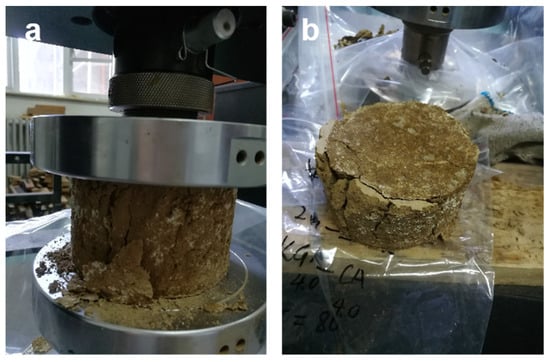 As the previous preparation method [,,], firstly, dry the soil thoroughly in the oven. Weigh 400 g of dried soil, mix it with 100 g of pure water, and stir evenly. The molds for soil columns can be categorized into two distinct types: Type 1 molds possess a diameter of 50 mm and a height of 50 mm, while Type 2 molds feature a diameter of 100 mm and a height of 64 mm. When utilizing Type 1 molds for the preparation of soil columns (Model 1), approximately 100 g of moist soil is required. In contrast, the use of Type 2 molds for crafting soil columns (Model 2) necessitates approximately 400 g of moist soil. After removing the mold, the KGM/CA/PVA blending adhesive needs to be coated to the surface of the soil columns. The consolidated soil column can be obtained by drying and consolidating at room temperature for 24 h. The amount of adhesive used on the surface of the same type of soil column is controlled equally: Model 1 requires approximately 10 g of adhesive, while Model 2 requires approximately 40 g of adhesive.