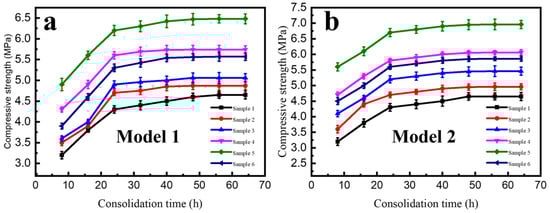 Following the application of the KGM/CA/PVA polymer-based soil consolidation agent onto the surface of the soil columns, the current adhesive undergoes a drying period of 8–24 h on the soil column surface, resulting in the surface hardening of the consolidated soil columns. In our research, we observed that in two different types of consolidated soil columns (Model 1 and Model 2), as the consolidation time extended from 8 h to 24 h, the compressive strength of the consolidated soil columns increased slightly faster. However, when the consolidation time was further extended from 24 h to 48 h, the rate of increase in compressive strength of the consolidated soil columns slowed down. After a consolidation time exceeding 48 h, the compressive strength of the consolidated soil columns remained relatively constant, as illustrated in Figure 7a,b. Overall, in Model 2, the compressive strength of the consolidated soil column is slightly higher than that in Model 1, as shown in Figure 7a,b.