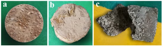 The influence of consolidation agent types on resistance of consolidated soil columns to transportation-induced vibrations. (a) The state of the consolidated soil column prepared under the preparation conditions of Type 1 after the oscillation test of Method 1; (b) The state of the consolidated soil column prepared under the preparation conditions of Type 2 after the oscillation test of Method 1; (c) The state of the consolidated soil column prepared under the preparation conditions of Type 3 after the oscillation test of Method 1.