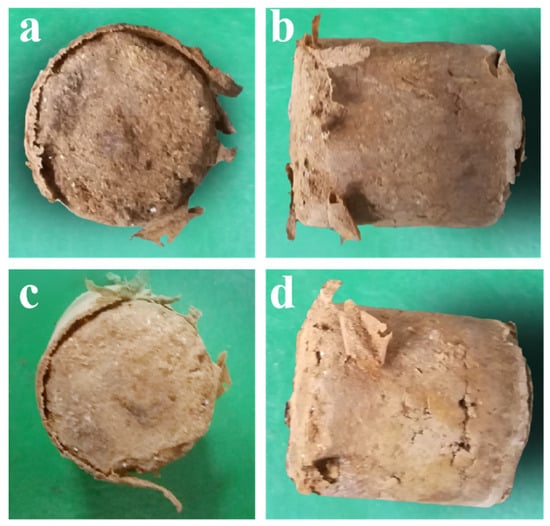 Consolidated soil column with surface wear. (a) The upper surface wear of the consolidated soil column with a drying time of 24 h after the oscillation test of Method 1; (b) The side surface wear of the consolidated soil column with a drying time of 24 h after the oscillation test of Method 1; (c) The upper surface wear of the consolidated soil column with a drying time of 30 h after the oscillation test of Method 1; (d) The side surface wear of the consolidated soil column with a drying time of 30 h after the oscillation test of Method 1.