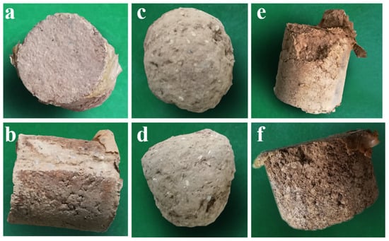 Worn and fragmented consolidated soil columns. (a) The upper surface wear of the consolidated soil column with a drying time of 50 h after the oscillation test of Method 1; (b) The side surface wear of the consolidated soil column with a drying time of 50 h after the oscillation test of Method 1; (c) After the surface consolidation adhesive film of the consolidated soil column in (a) was worn, the state of the upper surface of the soil column after oscillation testing using Method 1 again; (d) After the surface consolidation adhesive film of the consolidated soil column in (a) was worn, the state of the side surface of the soil column after oscillation testing using Method 1 again; (e) After the oscillation test of Method 1, the surface fragmentation state of Model 1’s consolidated soil column with a drying time of 18 h; (f) After the oscillation test of Method 1, the surface fragmentation state of Model 2’s consolidated soil column with a drying time of 18 h.