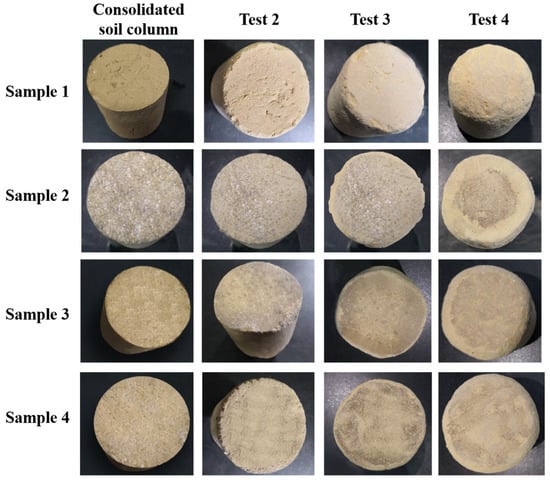 Indeed, as shown in Figure 6, it becomes evident that larger soil particle sizes result in better permeability of the adhesive, leading to a thicker consolidation film formed by the adhesive and soil on the surface of the consolidated soil columns. Consequently, these consolidated soil columns exhibited improved resistance to compression. Additionally, as observed in Figure 6 for samples 6 and 12, when using soil with non-uniform particle sizes to prepare consolidated soil columns, the uneven voids within the soil column led to non-uniform consolidation film thickness, which can also affect the corresponding consolidated soil columns’ compressive performance.