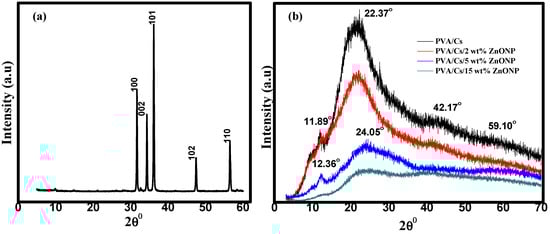 XRD of (a) ZnO NPs and (b) PVA/Cs and PVA/Cs/ZnO NPs composites.