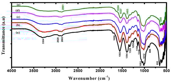 ATR-FTIR spectra were performed to understand the chemical and structural nature of PVA/Cs/ZnO nanocomposites. Figure 2 illustrates the ATR-FTIR spectrum of the PVA/Cs blend and PVA/Cs/ZnO nanocomposites. The spectra of FT-IR confirmed the interaction between metal oxide and polymeric materials in the wavenumber range 500–4000 cm−1. The characteristic FT-IR spectrum of the PVA/Cs blend is depicted in Figure 2a. The intense and broad transmission band centered at 3304 cm−1 was assigned to the stretching vibration of the –OH and –NH2 groups and to O–H/N–H interacting with the oxygen of the C=O group []. The bands at 2928 and 2863 cm−1 were attributed to the asymmetric stretching vibration of CH3 and CH2 of chitosan []. The bands at 1656 cm−1 were ascribed to C=O stretching (Amide I), 1563 cm−1 to N-H bending (Amide II), and 1394 cm−1 to –COO- stretching vibration. The bands at 1325 cm−1 were ascribed to C–O stretching and 1252 cm−1 to O–H bending [,]. The transmission bands at 1158, 1051, and 1012 cm−1 were attributed to the glycosidic linkage and C–O–C vibration of the glucose ring []. The band at 1116 cm−1, which was observed as a minor shoulder, was attributed to β(1–4) glucosidic stretching []. The band at 886 cm−1 was ascribed to unsaturated CH2 stretching of PVA [].