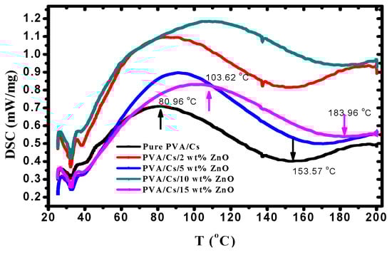 Thermal properties of PVA/Cs/ZnO nanocomposites were studied using DSC to interpret the influence of ZnO NPs on the glass transition temperature (Tg) of PVA/Cs/ZnO nanocomposite samples. DSC thermograms of all samples are displayed in Figure 3 and the results are summarized in Table 2. It is noted that the incorporation of ZnO nanoparticles increased the Tg value of the PVA/Cs blend from 80.96 °C to 103.62 °C. The glass transition process was affected by the chain stiffness and molecular packing []. The increase in Tg values with the increase in ZnO content may be due to the confinement effects and the strong coupling between the PVA/Cs blend and ZnO nanoparticles. This coupling leads to the restriction of the segmental motion of the molecular chains and hence the increase in Tg.