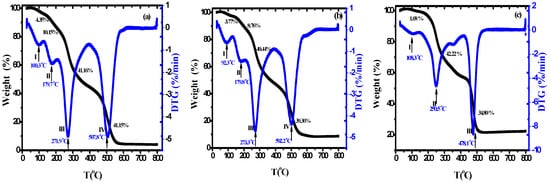 The thermal properties of nanocomposite materials are among the most important properties that are used in packaging applications, particularly in food packaging. TGA is a very important tool for assessing the thermal stability of manufactured nanocomposite materials. Figure 4a–c displays the (TGA) and DTG plots of the PVA/Cs blend and PVA/Cs/ZnO nanocomposites in the temperature range from 25 to 800 °C. It can clearly be seen that the thermal degradation of pure PVA/Cs and nanocomposites with low ZnO NPs content was achieved in four steps, while for nanocomposites with high ZnO NP content it was achieved in three steps. It has been reported that the addition of ZnO to different polymer matrices leads to degradation or stabilization effects []. In the first stage, the weight loss for all samples was attributed to the evaporation of water in all samples at different maximum temperatures (Tm) depending on the content of ZnO NPs in the nanocomposite samples. The water absorption in the PVA/Cs blend is related to the availability of hydroxyl and amino groups that interact with water molecules through hydrogen bonding [].