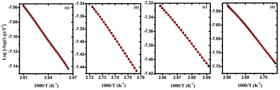 Log[−log(1−g)/T2] against 1000/T in the first stage for (a) PVA/Cs, (b) PVA/Cs/2 wt% ZnO -NPs, (c) PVA/Cs/5 wt% ZnO - NPs, and (d) PVA/Cs/10 wt% ZnO -NPs.