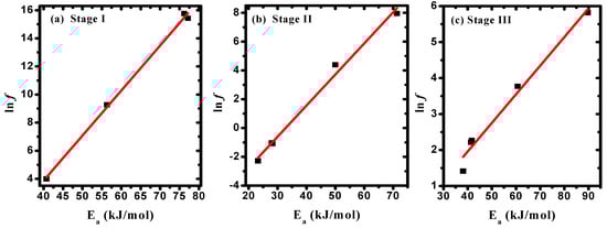Frequency factor versus the activation energy in (a) stage I, (b) stage II, and (c) stage III.