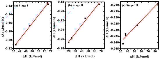 The correlation between Ea and f values, as given in Table 4, confirmed the existence of the compensation phenomenon or the isokinetic effect [], as illustrated in Figure 7a–c. The observed linear relationship between (ΔS) and (ΔH) indicated the existence of the compensation phenomenon in PVA/Cs/ZnO nanocomposites, as shown in Figure 8a–c. Such behavior has been reported for various polymer blends and polymer composites [,,]. Structural changes that may arise when increasing the temperature of the polymeric material to reach equilibrium is the reason for the existence of the linear relationship between ΔH and ΔS, i.e., the variation in ΔH values is compensated by the variation in ΔS values [].