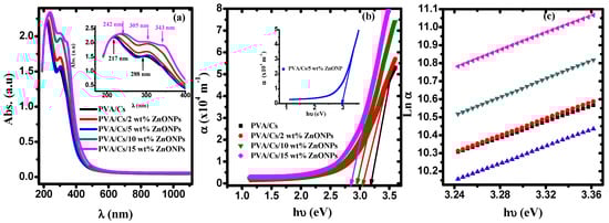 Figure 9a displays the absorption spectra of the PVA/Cs blend and PVA/Cs/ZnO nanocomposites. The spectra of the PVA/Cs blend show an absorption band at 217 nm and a shoulder centered at 288 nm. These bands are attributed to π-π* and to n-π* transition, respectively []. These bands shifted after incorporating ZnO NPs and appeared at 242 nm and 305 nm, and a new absorption peak characteristic to ZnO nanoparticles was observed at 343 nm in the highly doped PVA/Cs/ZnO nanocomposite samples []. These observations are an indication of the complexation between the ZnO NPs and PVA/Cs matrix by hydrogen bonding through OH groups. Also, the absorption edge was found to be red-shifted to higher wavelengths (lower energies) by increasing the content of ZnO nanoparticles in the PVA/Cs/ZnO nanocomposites.