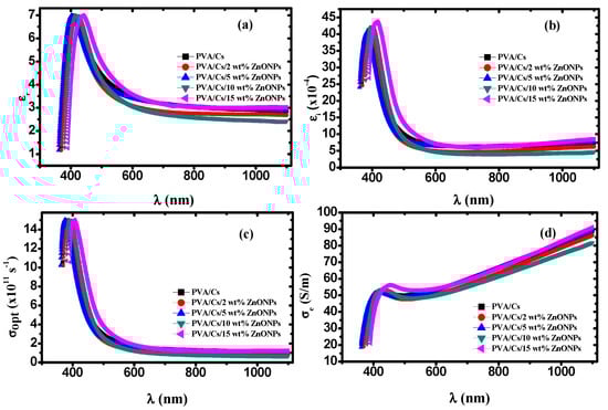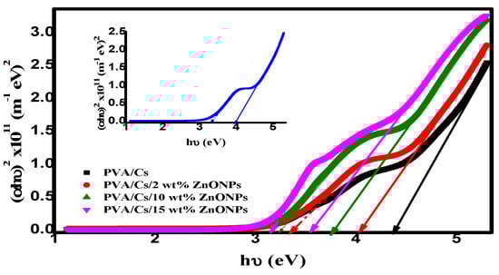 The values of the absorption edges were estimated from the plot of absorption coefficient (α = 2.303 A/d; A is the absorption and d is the thickness of the samples) against the incident photon energy (hυ), as shown in Figure 9b. By extrapolating the linear portion of Figure 9b to α = 0 on the x-axis, values of the absorption edge are estimated and given in Table 5. The observed shift in the absorption edge to lower energies (higher wavelengths) with increasing the content of ZnO in PVA/Cs nanocomposites could be attributed to the phase transition, i.e., from the crystalline phase to the amorphous phase, which ultimately may reflect in the optical bandgap energy values. This shift is an indication of the existence of intra-/intermolecular interaction among Zn+ ions and adjacent OH groups in the PVA/Cs matrix.