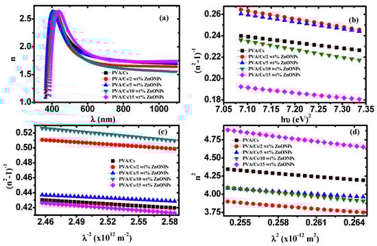 where R is estimated using the empirical formula and T is the transmittance, respectively []. Figure 11a displays the variation of the refractive index against wavelength for all samples. It is observed that the refractive index showed dispersion behavior in the range of 400–600 nm. This dispersion can be interpreted using the single oscillator model (SOM). The correlation between refractive index and photon energy can be presented as follows []:
