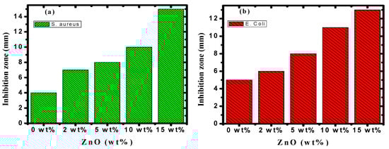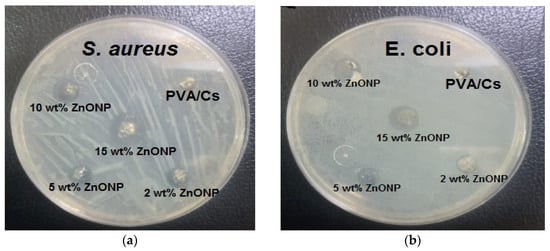 The antibacterial activity of PVA/Cs and PVA/Cs/ZnO nanocomposites was evaluated against (S. aureus) and (E. coli) bacteria with the agar well diffusion method by evaluating the zone of inhibition (mm). This method was reported previously in more detail [,].