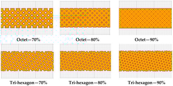 The three infill patterns employed with infill percentages varying from 70% to 90%.