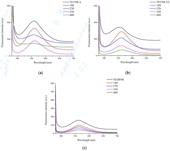The fluorescence images captured by CLSM of the fluorescence dye labelled specifically for proteins are shown in Figure 1, where green represents tagged proteins. These fluorescence images reveal the higher protein content of FNR samples compared to DPNR due to the reduction in the number of proteins after deproteinization. The changes in protein contents during prolonged storage of latex were determined by fluorescence spectra recorded using a JASCO FP-6200 spectrofluorometer. Figure 2 presents the fluorescence spectra of (a) FNR-A, (b) FNR-TZ, and (c) DPNR over a storage period of up to 40 days. The spectra were obtained using Qubit protein dye (with baseline compensation) and analyzed via UV–vis spectroscopy at a wavelength (λ) range of 450–700 nm. Among these samples, FNR-A latex exhibited the highest number of dye-binding particles compared to the FNR-TZ and DPNR latexes. A notable trend observed was the decrease in detectable signal intensities with the progression of storage time. This indicates that there are continuous changes in protein composition with storage. However, an exception was observed for the FNR-A latex at 40 days, with a lower intensity than that at 33 days.