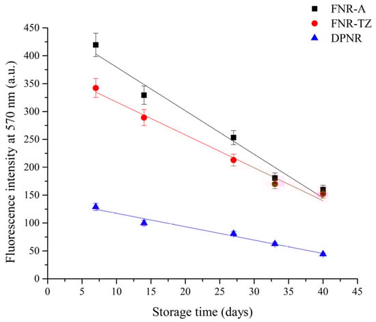 Average fluorescence emission intensity of the proteins on the rubber particles of FNR-A, FNR-TZ, and DPNR latexes at λ 570 nm, as a function of storage time.