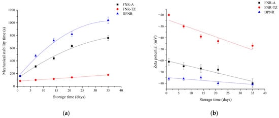 (a) Mechanical stability time and (b) zeta potential as a function of storage time for FNR-A, FNR-TZ, and DPNR latexes.