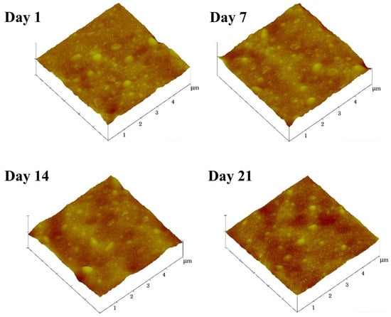 The surface morphology of latex films prepared from DPNR latex and stored for 35 days was viewed on days 1, 7, 14, and 21 after preparation (Figure 8). The morphology of DPNR was distinct from that of the other two latexes. The surfaces were tacky, and right from the first day the films were merged without visible holes. The mixed layer of protein and LCFA soaps surrounding the latex particles in DPNR latex has been removed during deproteinization and replaced by non-ionic surfactants. Without this mixed layer surrounding the latex particles, the diffusion of rubber molecules between particles will be unimpeded, facilitating the coalescence of latex particles to form a continuous and smooth film [].