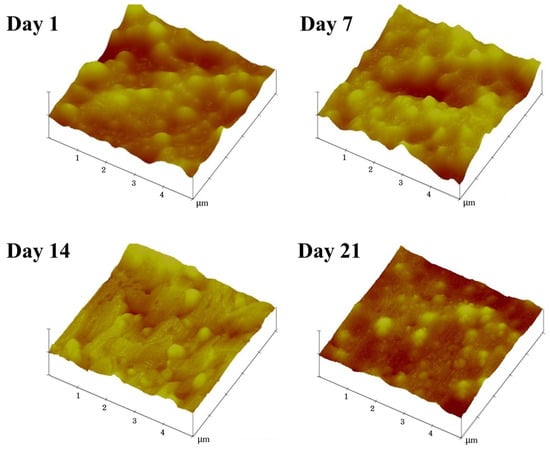 In the study of the film formation and film morphology, two different sets of storage methods were used. In the first method, FNR-A, FNR-TZ, and DPNR latexes were stored in the dark for 35 days to undergo hydrolysis, then dip-coated on glass plates, and subsequently the dip-coated films were kept for 1 to 21 days prior to AFM analysis. The aim was to study the effects of hydrolyzed proteins (by ammonia for 35 days) on the aging of latex films. The results are shown in Figure 6, Figure 7 and Figure 8. In the second set of experiments, the samples were dipped in latex stored for a specific number of days (from 0 to 40 days), and then the film formation process was observed by AFM immediately from the nascent stage. The objective was to determine the effect of aging (storage) on the latex film and the accompanying evolution of the surface roughness profile of the resulting dipped films with time. This second set of experiments indirectly examined the effects of the extent of protein hydrolysis and the accompanying protein composition changes on the film formation process and kinetics (Figure 9).