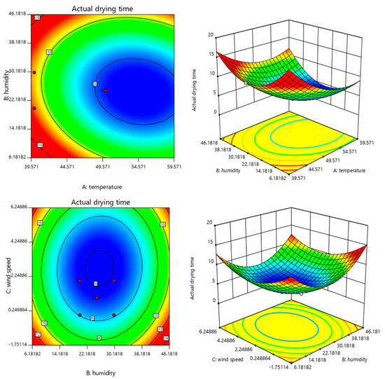 The multivariate regression equations between drying time (wear resistance) and temperature (A) as well as humidity (B) and wind speed (C) were analysed using Design-Expert 11.0. The multivariate regression equation for drying time and wear resistance are Equation (1) and Equation (2) respectively.