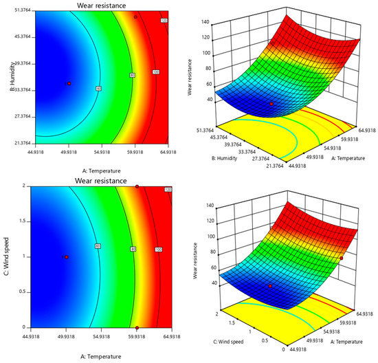 The response surface and contour of temperature, humidity and wind speed for the wear resistance. (Left is the response surface, right is the contour map).