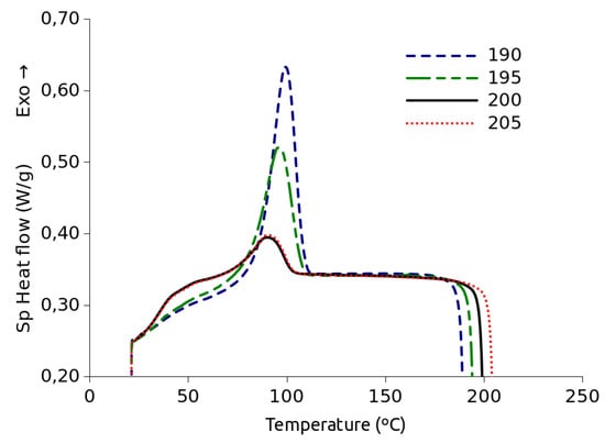 Figure 1 shows how heat flow exothermal peak shape changes from 190 to 200 °C, which is an indication that different amounts of self-nuclei exist in the different samples. At 195 °C there are still some remaining self nuclei. However, it can be seen that there is no difference between the plots obtained at 200 °C and 205 °C. This proves that at 200 °C there remain no more self nuclei. Consequently, that temperature was chosen for the initial treatment in the isothermal crystallization experiments. On the other hand, additional crystallization experiments performed with 6.42 and 11.70 mg samples showed no significant differences, as can be seen in Figure A2 of the Appendix A. This confirms that 11 mg is not an excessive size in this context.