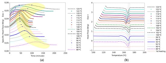 DSC analysis indicates that two components are needed to accurately fit the crystallization exotherms in the high-temperature range, from 114 to 124 °C. That is congruent with the fact that two crystal structures, α and α′, are formed in that range of temperatures, as reported in a number of works [,,,,,]. At lower temperatures, good fits are obtained with only one logistic component. It does not mean that only one crystal structure exists, but the contribution to the exotherm of one of them is practically negligible compared to the other. Thus, considering other reports, the predominant crystal structure in the low range of temperatures covered in this work is α′ []. In Figure 2, the green and yellow areas are shaded to highlight the apparent contribution of the α and α′ structures to the exothermic DSC peak. The α effect starts very weakly around 108 °C and becomes more evident with increasing temperature. However, the temperature increase also causes the two crystallization processes corresponding to α and α′ to appear more and more strongly overlapped. This overlap appears more marked at higher temperatures, which means that at these temperatures the two crystalline forms form simultaneously.