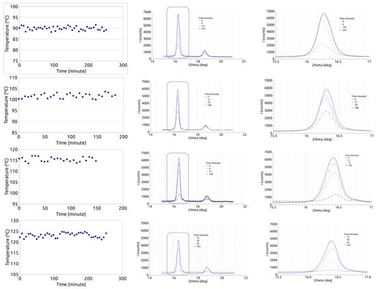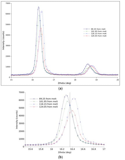 Figure 4 shows the stable diffractograms obtained in crystallization from the melt at the indicated temperatures. The peaks of the patterns at 89 and 102 °C are located on the left side with respect to those of the 116 and 124 °C patterns. That points to two different crystalline structures. The correspondence of XRD diffractograms to specific crystal structures was covered in a number of works [,,,,,,].