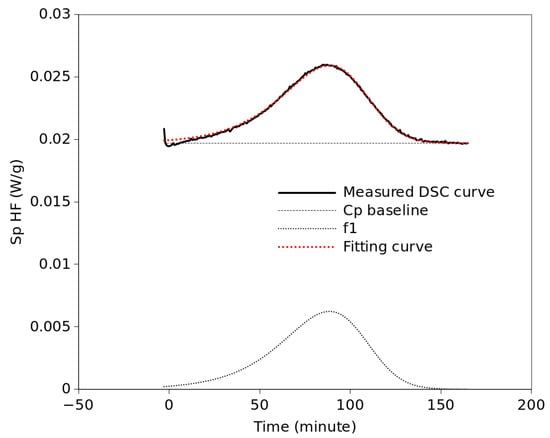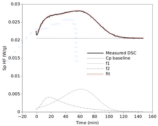 In addition, the symmetry parameter, τ, which was set constant for each process, resulted in very different values for each function, 0.23 for f1 and 7.86 for f2. Considering that a perfect symmetry corresponds to τ = 1, each process is skewed in the opposite direction with respect to the other, as can be observed in Figure 6. Considering Equation (2), τ can be theoretically related to a supposed reaction order. That would point to a high complexity of the crystallization process of the α structure, described by f2, with a value that is absolutely out of the range of values described for any type of reaction.
