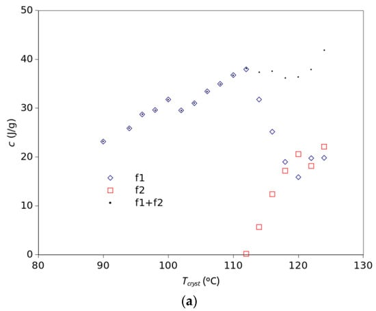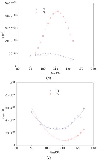 An additional restriction consisted of constraining the symmetry parameter to take the same value at any temperature as long as it was the same crystallization process. This way, it was possible to fit all curves reasonably well in the 90 °C to 112 °C range. However, at higher temperatures there is an important shoulder at the beginning of the isotherm which makes it impossible to properly fit the entire curve by a single TDGL function. Thus, a new TDGL function was added to the model as displayed in Figure 6. Although Equations (1) and (2) are equivalent, the fit was performed with Equation (1) since the fitting is simpler if the conversion, x, is not required. For those exothermic peaks where a good fit with a single component is not evident, single- and dual-component fittings were performed and the resulting fits were compared both visually and by ASE. Whenever the quality of fit achieved with one function was similar to that achieved with two functions, the single-function fit was chosen. In the case of two components, two identical expressions of Equation (1) were used and the parameter values for each component were optimized. Before performing the optimization process, two constraints were imposed: First, for simplicity, and taking into account the shape of the exothermic peaks observed in the DSC curves, it is assumed that the left–right asymmetry of each crystallization process does not change significantly with temperature. This means that a single value of τ will be optimized for each component at all temperatures. Second, the parameter b in Equation (1) depends on temperature, as described in Equation (3). Therefore, taking into account these constraints, all isothermal curves were fitted simultaneously by the Gnumeric software using one or two functions described by Equation (1), where the parameter b was substituted by Equation (3). In the end, for each component unique values of τ, tcryst, Tcent, and Thwhm were obtained for all temperatures. This means that the values of b are different at each temperature, following the trend described by Equation (3) with the optimized parameters. Likewise, tapm takes a different value at each temperature. Table 1 shows which TDGL functions, f1 or f2, were used for each temperature and the ASE values obtained in each case. According to the ASE values, similar quality of fittings was obtained in the low range of temperatures with only one function than in the high-temperature range with two components. Table 2 shows the parameter values, according to Equation (3), obtained for the rate parameter of each function from the simultaneous fitting of all curves. It is noticeable that although f1 reaches its maximum rate at 8 °C below f2, f2 is much faster, with a characteristic time a quarter of that of f1. However, although the b factor favors f2, for some other reason the structure represented by f2 does not actually form at temperatures below 110 °C. All fittings are presented in Figure A3 of the Appendix A. Figure 7 shows the dependence of the fitting parameters on temperature. As mentioned above, the c parameter represents the area of the crystallization peak for each mathematical component, f1 and f2. It is assumed here that each of these components corresponds to a different crystal form, α or α′. Thus, the c values represent the crystallization enthalpies of each crystal structure and should be proportional to the amount of each crystal structure formed. According to Figure 7a, the area of the crystallization process, represented by f1 + f2, generally increases with temperature. For the low-temperature range that total area is represented by a single function f1. That means that f1 represents α′, taking into account the present XRD results together with the literature reports mentioned above. Similarly, f2, which appears at 112 °C and its relative weight increases up to 124 °C whereas the weight of f1 decreases in the same range of temperature, can be easily related to the α structure. Figure 7b depicts how the rate factors change with temperature, according to the values in Table 2. In general, the values of b for f2 are much higher than those for f1. However, as commented in Figure 7a, regardless of the values of the rate factors, there is only the α′ component, f1, in the 90–110 °C range. At 112 °C the area of f2 was only 0.16, which means that the amount of α crystals formed at that temperature is practically negligible. Figure 7c plots the values of the tapm of f1 and f2. That time represents the time elapsed from the beginning of the isotherm to the peak maximum. These values resulted from the fittings of the curves and seem to follow parabolic trends, although there are no values of tapm in the 90–110 °C range because in that range of temperatures only one function was needed for the fittings. Similar trends were reported in other works for the half-time crystallization of PLLA as a function of the temperature of crystallization [].