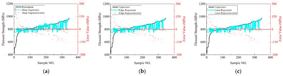 Figure 10 offers a detailed comparison of the bending strength predictions from the nine distinct machine learning models against the experimental values, highlighting their predictive accuracy through specific metrics such as the maximum and minimum errors, the count of samples with significant errors (≥20 MPa), and the overall distribution of these errors.