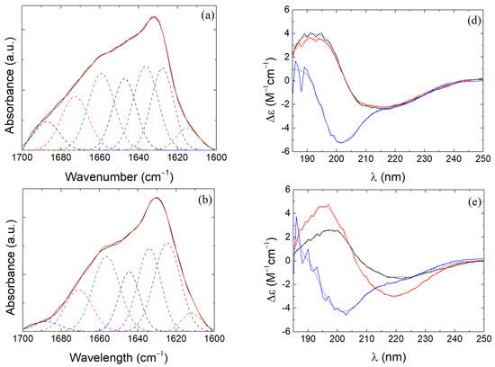 For the evaluation of the secondary structure of the deconvolution of the amide I group from 1600 to 1700 cm−1, a code written in MATLAB for the nonlinear least-squares method was used, which determines the superposition of Gaussian peaks. The general formula, , consists of the absolute weight , the standard deviation and the position of each Gassian peak. Initial conditions for each of the three latter parameters were selected according to the experimental data of the FTIR spectra to assist the convergence of the algorithm. A single Gaussian peak or a pair of two is attributed to one secondary structure element. The percentage of each secondary structure element was computed by the relative weight of every Gaussian peak [50,55].