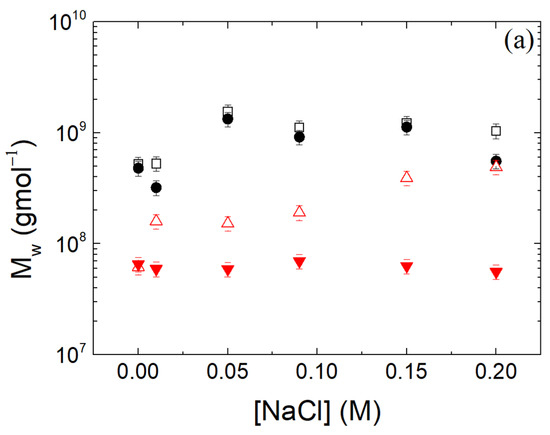 (a) Molecular mass Mw, (b) radius of gyration Rg and (c) hydrodynamic radius Rh (CONTIN 90°) in relation to NaCl concentration for thermally treated β-LG/CS NPs with (filled circles and reverse triangles) and without (unfilled squares and triangles) T80 at pH 4 (black) and 7 (red).
