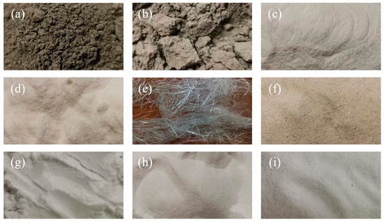 Raw materials: (a) cement, (b) FA, (c) DF, (d) VMA, (e) PE fiber, (f) QP, (g) PET-S, (h) PET-M, and (i) PET-L.