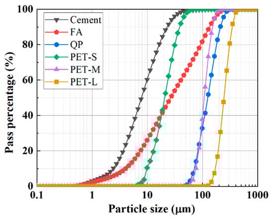 Figure 1 and Figure 2 display the raw materials and their particle size distribution for P-ECC. The raw materials consist of water, cementitious materials, aggregates, fibers, and admixtures. The cementitious materials include P II. 52.5R ordinary Portland cement (Guangzhou Heidelberg Yuexiu Cement Co., Ltd., Guangzhou, China) and fly ash (FA, Longze Water Purification Materials Co., Ltd., Gongyi, China), with Table 1 showing the chemical composition of the cementitious materials. The aggregates include quartz powder (QP, Jiangmen Xiangyuan Co., Ltd., Guangzhou, China) and polyethylene terephthalate plastic powder (PET, DuPont Co., Ltd., Wilmington, CA, USA). The admixtures include a viscosity-modifying agent (VMA, Shandong Xinfuman Chemical Technology Co., Ltd., Zibo, China), a defoamer (DF, Nanjing Yaojie Energy Saving Technology Co., Ltd., Nanjing, China), and a high-range water-reducing agent (HRWRA, BASF Co., Ltd., Berlin, Germany). The main component of VAM is carboxypropyl methyl cellulose, with a purity of 90%. DF is a mixture of liquid hydrocarbons, polyethylene glycol, and amorphous silica, with an active ingredient content of 65%. The solid content of HRWRA is 49–51%, with a pH value of 5.0–8.0. Polyethylene fiber (PE fiber, Beijing Quantum Terra New Materials Technology Co., Ltd., Beijing, China) was used, with its physical properties detailed in Table 2. To study the impact of different PET aggregate particle sizes on P-ECC performance, three different particle sizes (PET-S, PET-M, PET-L) of PET aggregates were selected. PET-M was chosen to match the particle size distribution of quartz powder for the replacement experiment []. Table 3 compares the physical properties of QP and PET aggregates.