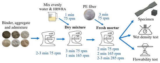 The mixing process of P-ECC is shown in Figure 3. The specimens were prepared using a 30-L planetary mortar mixer with 3 speed settings (low speed 75 r/min, medium speed 165 r/min, and high speed 285 r/min). First, the cementitious materials, aggregates, thickening agent, and defoamer were added to the mixer and mixed at low speed to ensure that the dry materials were evenly blended. Next, pre-mixed water and water-reducing agent were added. Once the mixture had fully absorbed the water, it was mixed at medium speed until a uniform paste was achieved. Finally, the mixer was returned to low speed, and the PE fibers were gradually added, adjusting to medium and high speeds based on the dispersion of the fibers to ensure that they were fully distributed in the paste.